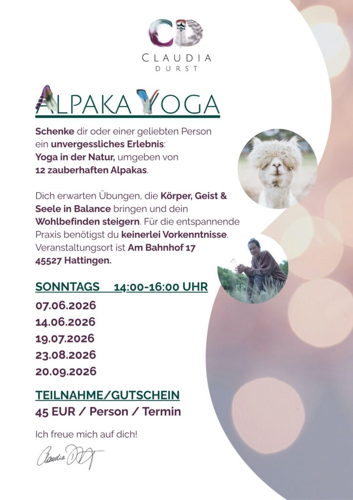 AktuellesWorkshops & Angebote >> Hier geht’s zu deinem Alpaka Yoga-Erlebnis. Infos & Anmeldung Schreib mir und erfahre, wie ich dir helfen kann. hallo@claudia-durst.de Impressum Haftungsausschluss Datenschutz